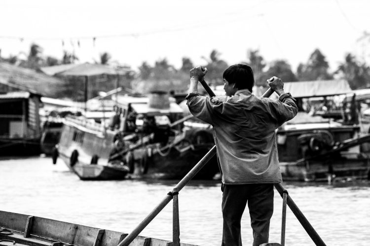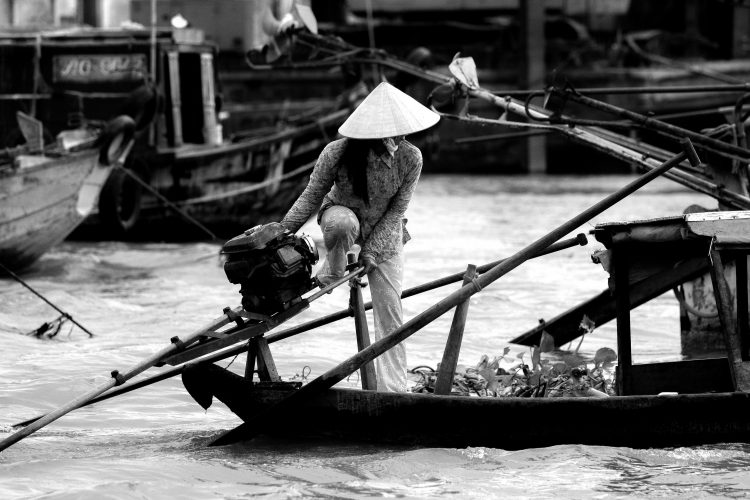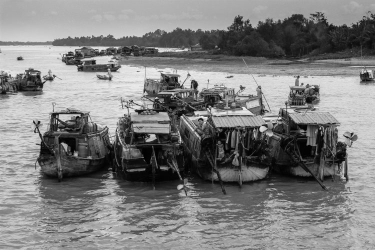 (Dec2009) To navigate on the Mekong river in Vietnam means being on the front row for observing the day to day life of the people who are living on and by the water. For the first time observer, life might look very chaotic. Only a closer look reveals how everything and everyday chores is intertwined together and makes one with the river.
